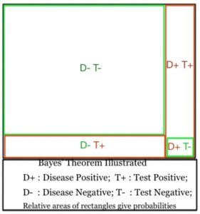 So what’s the probability that you actually have the disease if you test positive? It’s simply the ratio of people having the disease who test positive to the total number of people testing positive. In the illustration it would be the ratio of the area D- T+ to the total area testing positive, area D-T+ plus area D+T+