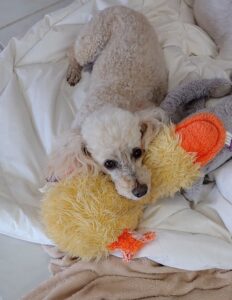 Contrary to the myth that poodles don’t like kids, Louie, that’s him in the photo with his duck, adores little ones. He’ll ignore adult attention for a bit of rub from a pint-size human.